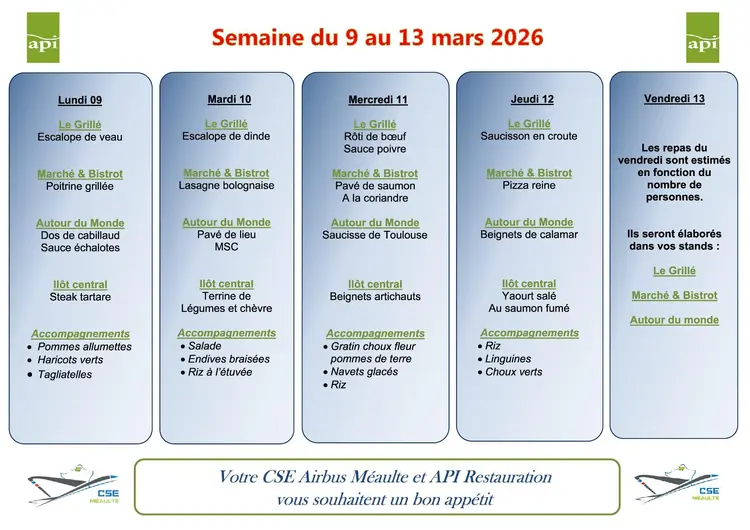 Menu du 9 au 13 mars 2026