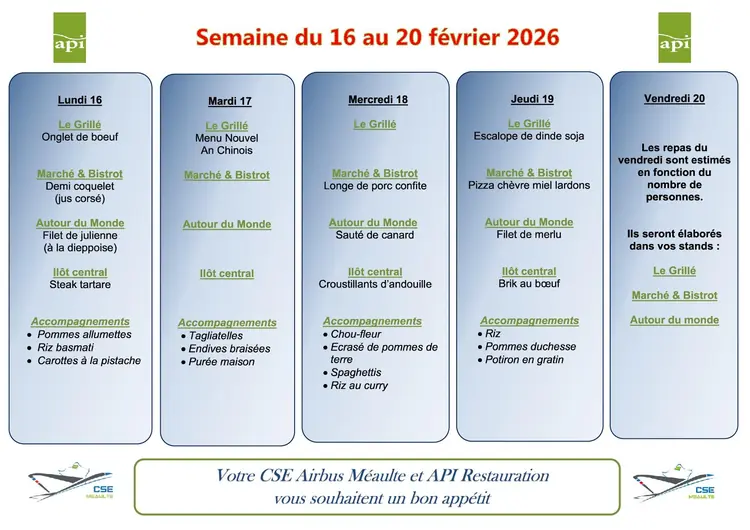 Menu du 16 au 20 février 2026