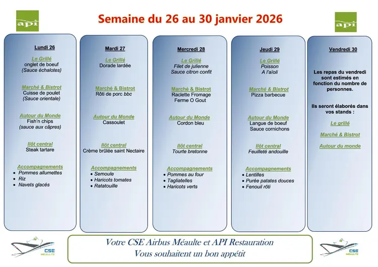Menu du 26 au 30 janvier 2026